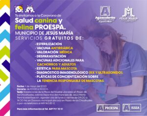 El Gobierno del Estado, a través de la Procuraduría Estatal de Protección al Ambiente (Proespa), invita a las y los habitantes del municipio de Jesús María a la Caravana de la Salud Canina y Felina que se llevará a cabo este jueves 4 de mayo en este municipio.