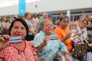Tere Jiménez detalló que con la Tarjeta Soluciones tendrán muchos beneficios; podrán realizar trámites y recibir descuentos en diferentes establecimientos, además de acceder a medicinas, operaciones, becas para sus nietos y mejoras para sus viviendas, entre otros beneficios.
