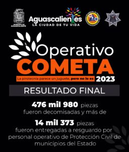 La Coordinación Municipal de Protección Civil de Aguascalientes dio a conocer el resultado del operativo “Cometa 2023”, llevado a cabo del 6 de diciembre de 2023 al 8 de enero del 2024, en coordinación con la Secretaría de Seguridad Pública Municipal y Protección Civil Estatal, con la finalidad de evitar riesgos y accidentes a la población e inhibir la compra, venta, almacenamiento y distribución de pirotecnia.