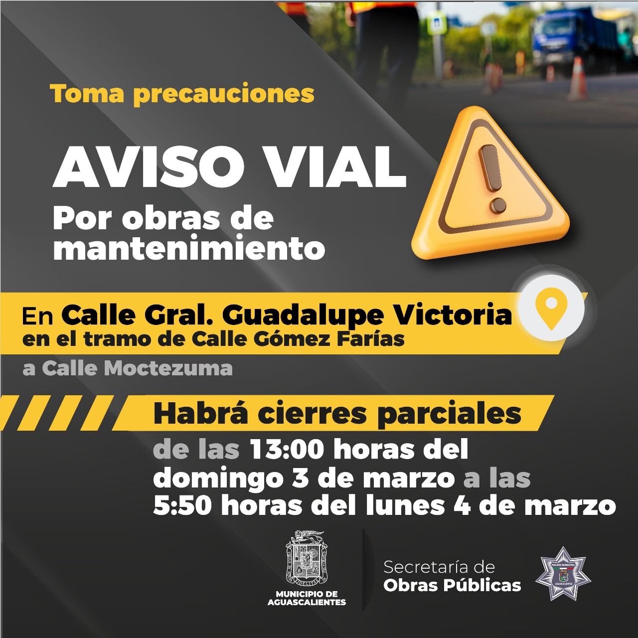 El Municipio de Aguascalientes hace un llamado a la ciudadanía a tomar precauciones debido a que con motivo de los trabajos de rehabilitación en la calle Guadalupe Victoria, en la zona Centro de la ciudad, se efectuarán cierres parciales a la circulación vial.