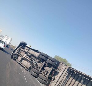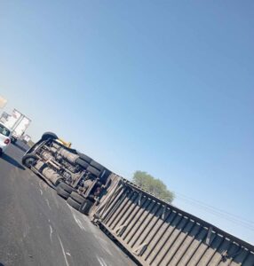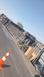 Cabe mencionar que todavía en este momento el tráiler está volcado, con lo que la circulación para salir de Aguascalientes está afectada y con carga vehicular.
