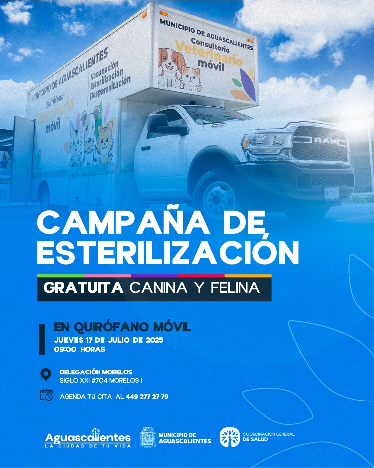 El Quirófano Veterinario Móvil de la Coordinación General de Salud del Municipio de Aguascalientes visitará los fraccionamientos José Guadalupe Peralta Gámez y el Morelos 1, en donde se realizarán los días 16 y 17 de julio esterilizaciones gratuitas caninas y felinas.
