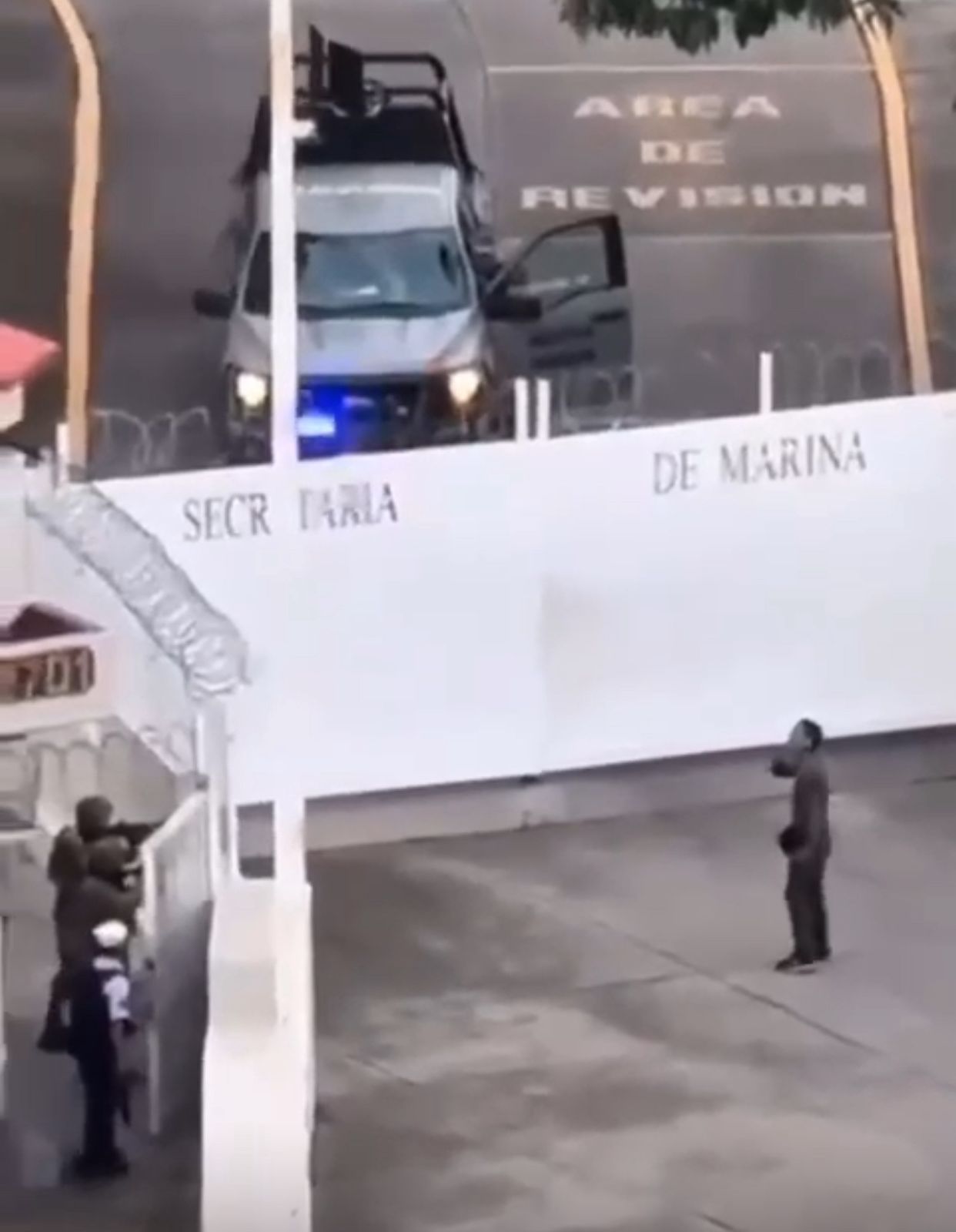 Un video difundido en redes sociales, muestra al hombre —de complexión delgada, con pantalón de mezclilla, tenis, playera verde oscuro y portando una cangurera— apuntando con una pistola a un guardiamarina, quien pese a estar bajo amenaza directa mantuvo su arma abajo, fuera de la vista, y continuó intentando tranquilizarlo verbalmente, sin hacer uso de la fuerza.