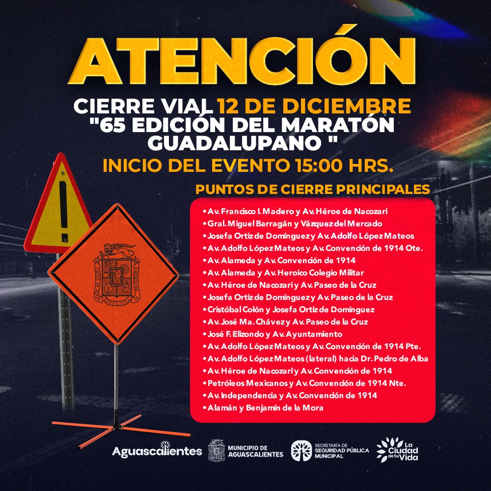 Con motivo de la 65.ª Edición del Maratón Guadalupano y el Maratón Juvenil Guadalupano, la Secretaría de Seguridad Pública Municipal (SSPM) informó sobre los cierres viales que se implementarán el viernes 12 de diciembre de 2025.