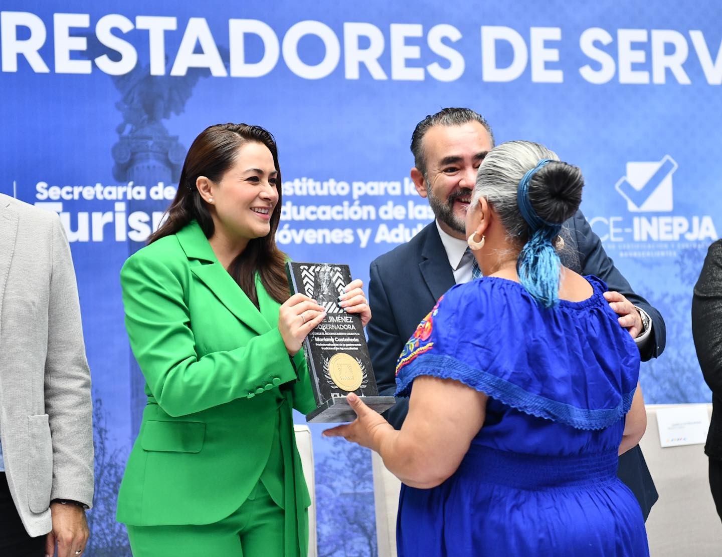 Durante el evento, Tere Jiménez y autoridades estatales también entregaron la insignia Gigantes a cinco personas por su aportación a la capacitación profesional de las y los aguascalentenses, así como a cocineras tradicionales y a una agencia de viajes por su labor para mejorar la atención a los visitantes.