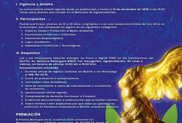 Está vigente hasta las 15:00 horas del viernes 14 de noviembre y podrán participar jóvenes de entre 15 y 29 años de edad El H. Ayuntamiento de Aguascalientes, a través del Consejo Municipal de la Juventud (Comuja) y del Instituto Municipal de la Juventud de Aguascalientes (Imjuva), anuncia la apertura de la convocatoria para el […]