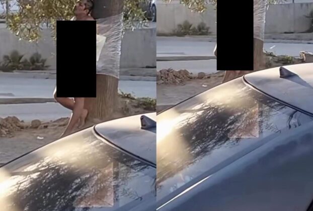 ¿POR INFIEL? LOCALIZAN A UN HOMBRE AMARRADO A UN ÁRBOL CON UN MENSAJE