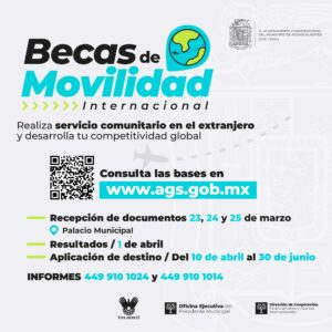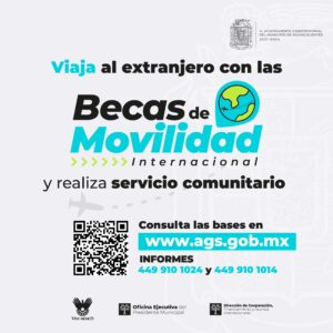 El Municipio de Aguascalientes en conjunto con la Organización Vive México, presentó la convocatoria para las 500 Becas de Movilidad del programa Jóvenes de Clase Mundial, a través de las cuales igual número de jóvenes de 18 a 35 años viajará a alguno de los más de 50 países disponibles a realizar servicio comunitario y fortalecer el intercambio cultural y su desarrollo competitivo.