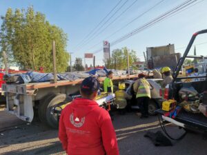 Los hechos se registraron la mañana de este miércoles cuando a través del Servicio de Emergencia reportaron que en la carretera 45 Norte en el Municipio de Pabellón de Arteaga, se había registrado un choque entre un tráiler Volvo, color tinto, con franjas blancas, el cual remolca una plataforma cargada con placas de acero y un vehículo Volkswagen, cuyos ocupantes se encontraban prensados.