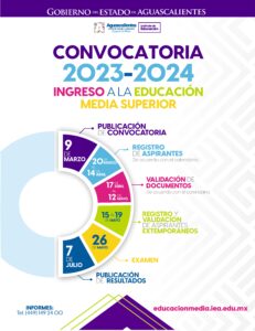 El Gobierno del Estado, a través del Instituto de Educación de Aguascalientes (IEA), informa a la comunidad educativa que ya fue publicada la convocatoria de Nuevo Ingreso a Educación Media Superior para el ciclo escolar 2023-2024 en la página https://educacionmedia.iea.edu.mx/