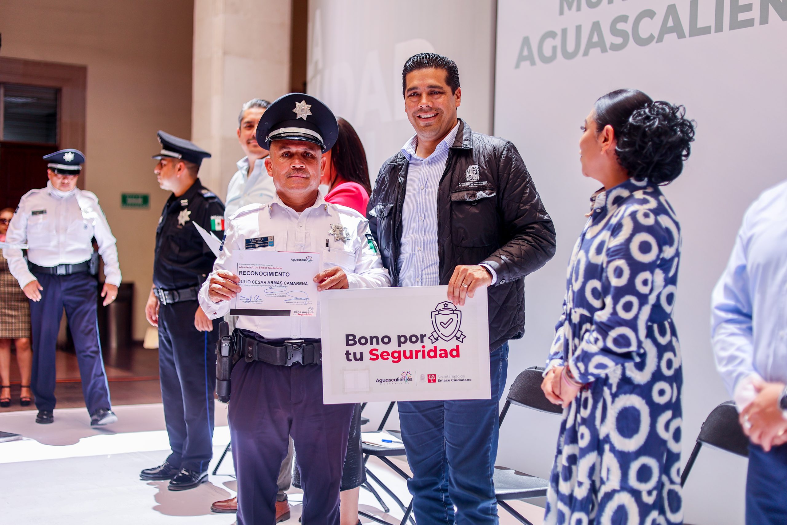 A través del Secretariado de Enlace Ciudadano y gracias a la colaboración de empresarios de Gasolineras Mobil, así como del gabinete social municipal, se entregó este incentivo a seis policías municipales y a 14 trabajadores de Servicios Públicos por el trabajo realizado en la Feria Nacional de San Marcos 2023.
