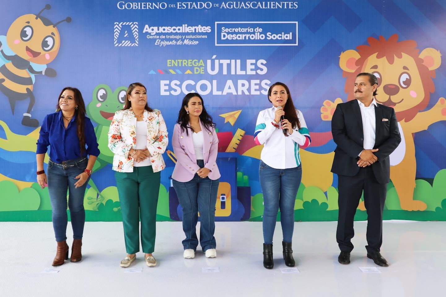 La gobernadora de Aguascalientes, Tere Jiménez, continúa recorriendo todo el estado para entregar apoyos escolares; en esta ocasión visitó la colonia Villerías, donde dio útiles escolares para los hijos e hijas de taxistas.