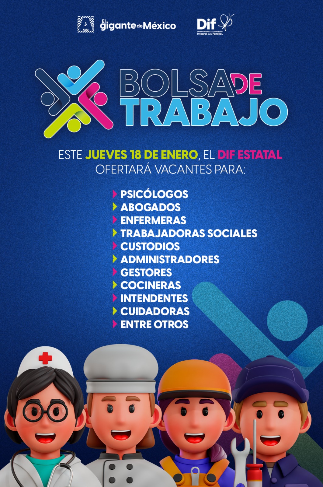 Este “Jueves de Bolsa de Trabajo”, además de las mil oportunidades laborales que se ofrecen cada semana, el DIF Estatal estará ofertando vacantes para psicólogos, abogados, enfermeras, trabajadoras sociales, custodios, administradores, gestores, cocineras, intendentes, cuidadoras, entre otros.