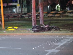 Al bajar del puente vehicular de Barberena Vega, debido al exceso de velocidad y la falta pericia, al llegar a la curva de la Zona Militar, su conductor perdió el control de manubrio, proyectándose contra el camellón central donde impacta un árbol lo que provoca que los ocupantes salgan disparados y la motocicleta se sigue de frente y derriba un señalamiento vial para luego detenerse.