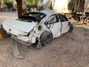 Sin embargo no lo logro siendo impactado y arrastro por la bestia, para después proyectarlo a un costado de las vías, quedando el conductor seriamente lesionado y el Jetta destrozado.