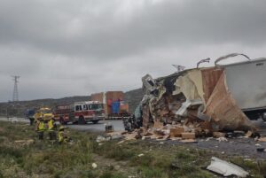 Del segundo tráiler que quedó volcado fuera la cinta asfáltica, resultó lesionado el chofe y una mujer que le acompañaba que fueron llevados al Hospital 2 del S.S