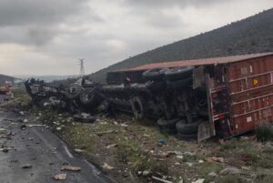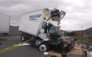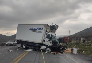 Al altura de ejido Guadalupe Victoria, al parecer el conductor de esta pesada unidad se quedó dormido por lo que se hacía lado izquierdo invadiendo el carril de contra flujo, estrellándose de frente brutalmente contra un tráiler, que se desplazaba en el carril de contra flujo.