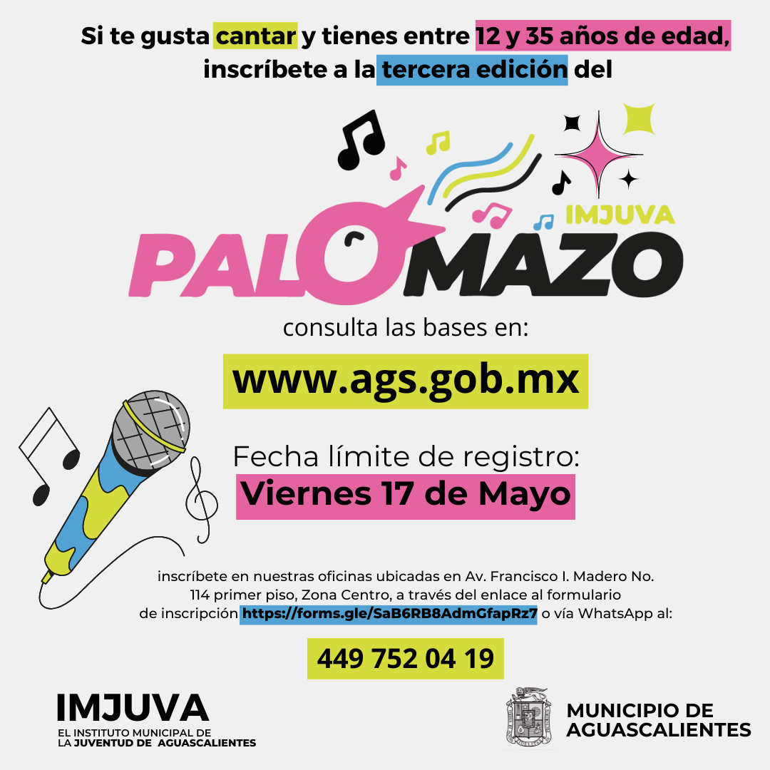 El Instituto Municipal de la Juventud de Aguascalientes (Imjuva) invita a las juventudes a participar en la tercera edición del concurso de canto “Palomazo” 2024, el cual se llevará a cabo en diferentes puntos de la ciudad.