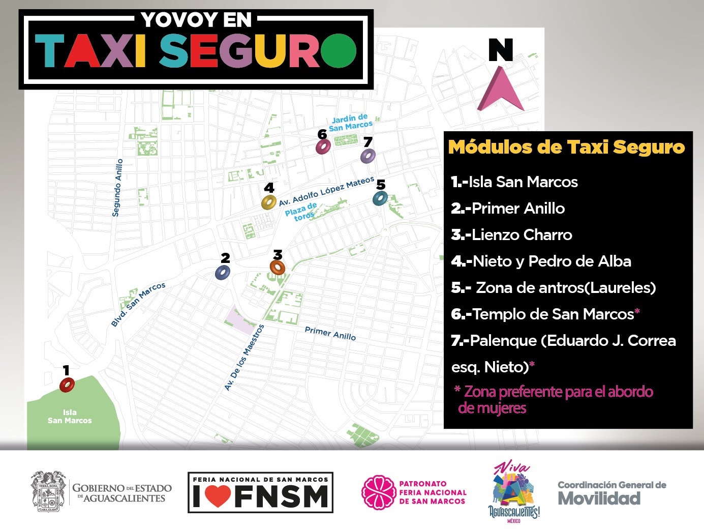 La Coordinación General de Movilidad (CMOV) informa que el programa de Taxi Seguro operará con tarifas especiales y temporales que únicamente están autorizadas durante la temporada de la Feria Nacional de San Marcos en aquellos taxis que sean abordados en los módulos de este programa.
