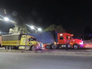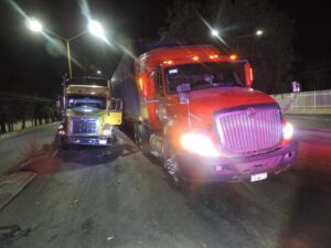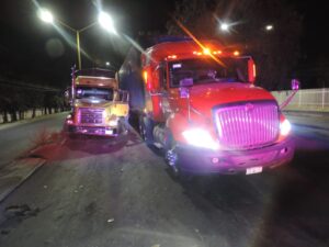 En ese momento a velocidad inmoderada aparece el torton amarillo el cual se desplazaba en la misma dirección pero por el carril derecho, al observar la patrulla y el tráiler detenido refiere el conductor “intenté frenar pero no me respondieron los frenos” por lo que impacta por alcance al trailer rojo logrando detenerse a la par de la primer unidad
