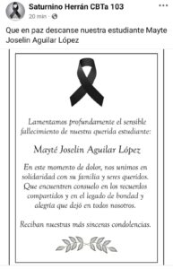 Quien no se pudo recuperar de las graves lesiones fue Mayte Joselin Aguilar Lopez de apenas 17 años, quien se encontraba recibiendo atención medica en el Hospital General de Pabellón de Arteaga, luego de participar en un accidente registrando en la 45 Norte, limites Aguascalientes con Zacatecas.