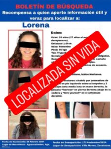 Lorena contaba con ficha de no localización desde el 17 de noviembre de 2024, después de acudir a un funeral en la entidad zacatecana en compañía de un hombre cuya identidad no ha sido revelada. Casi tres meses después, el 11 de febrero de 2025, fueron encontrados restos humanos parcialmente calcinados en un predio cerca de El Jagüey, pero permanecieron sin identificar hasta ahora.