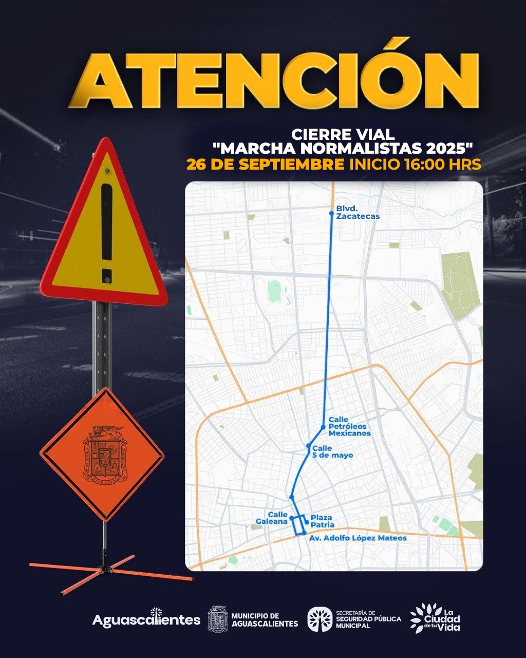 La Secretaría de Seguridad Pública Municipal de Aguascalientes (SSPM), a través de la Dirección de Movilidad y Tránsito, dispondrá de un operativo de seguridad y vialidad con motivo de la marcha que realizarán este jueves 26 de septiembre estudiantes de la Escuela Normal Rural Justo Sierra Méndez, de Cañada Honda.