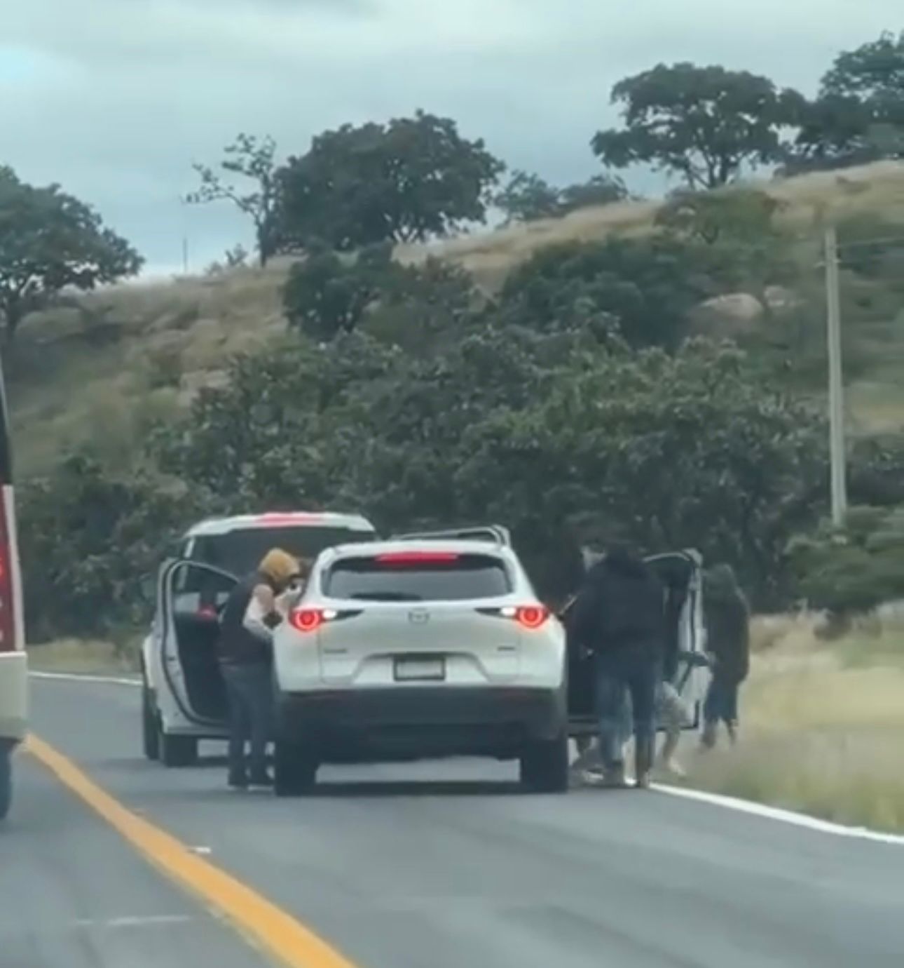 En la imagen se observa cómo un grupo de, por lo menos 4 hombres armados, descienden de otra camioneta, después de haberle cerrado el paso y bajan a la fuerza a los tripulantes de la unidad.
