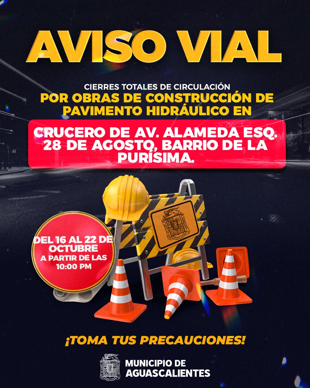 El Municipio de Aguascalientes, a través de la Secretaría de Obras Públicas, trabajará en la construcción de pavimento hidráulico en el crucero de la Avenida Alameda esquina con calle 28 de Agosto, en el Barrio de La Purísima.
