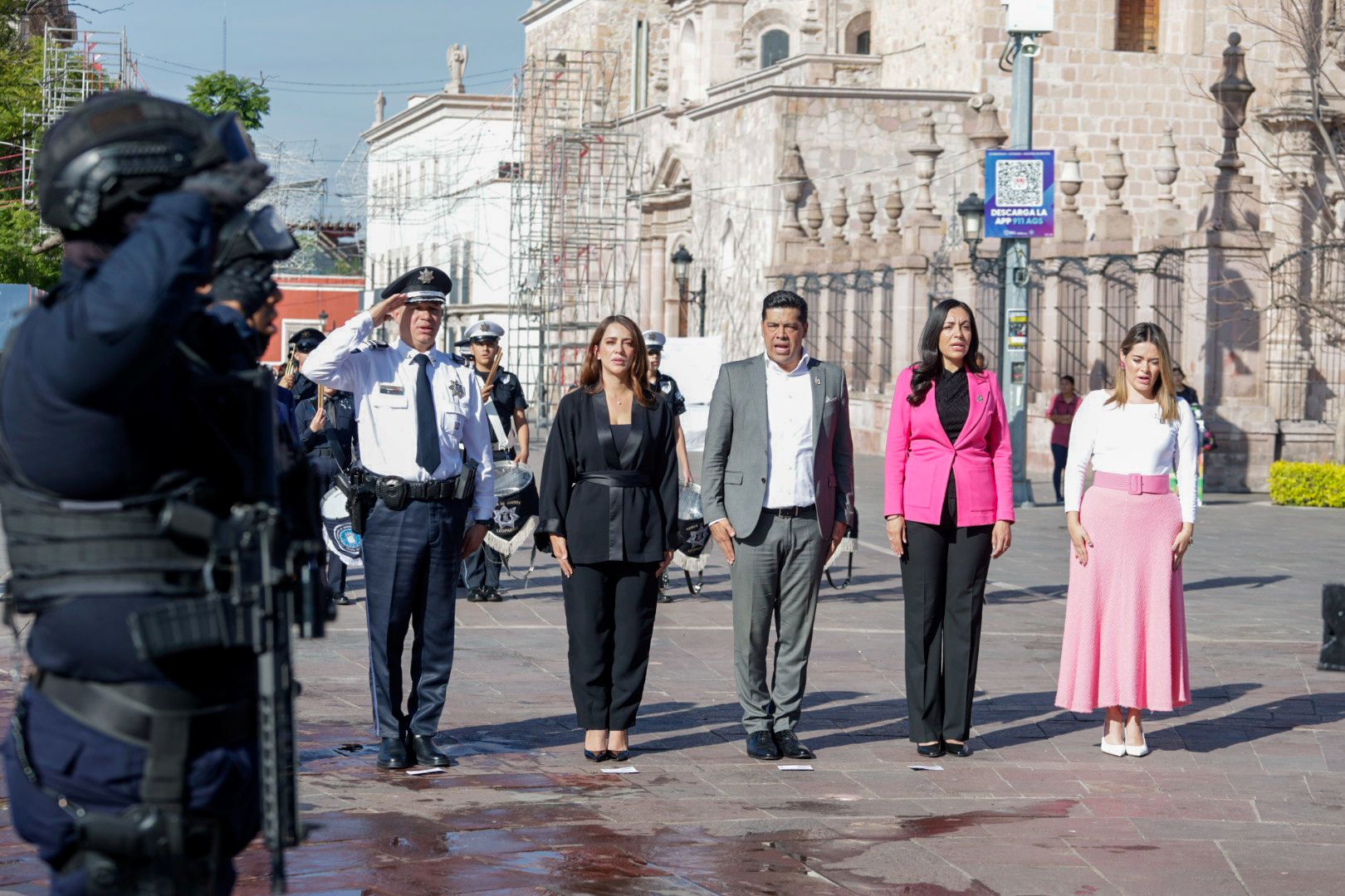Acompañado por los regidores del H. Ayuntamiento de Aguascalientes y por el titular de la Secretaría de Seguridad Pública del Municipio (SSPM), Gonzalo Pérez Zúñiga, el presidente municipal rindió honores al lábaro patrio en la Plaza Principal, para resaltar los valores cívicos y la proximidad social.