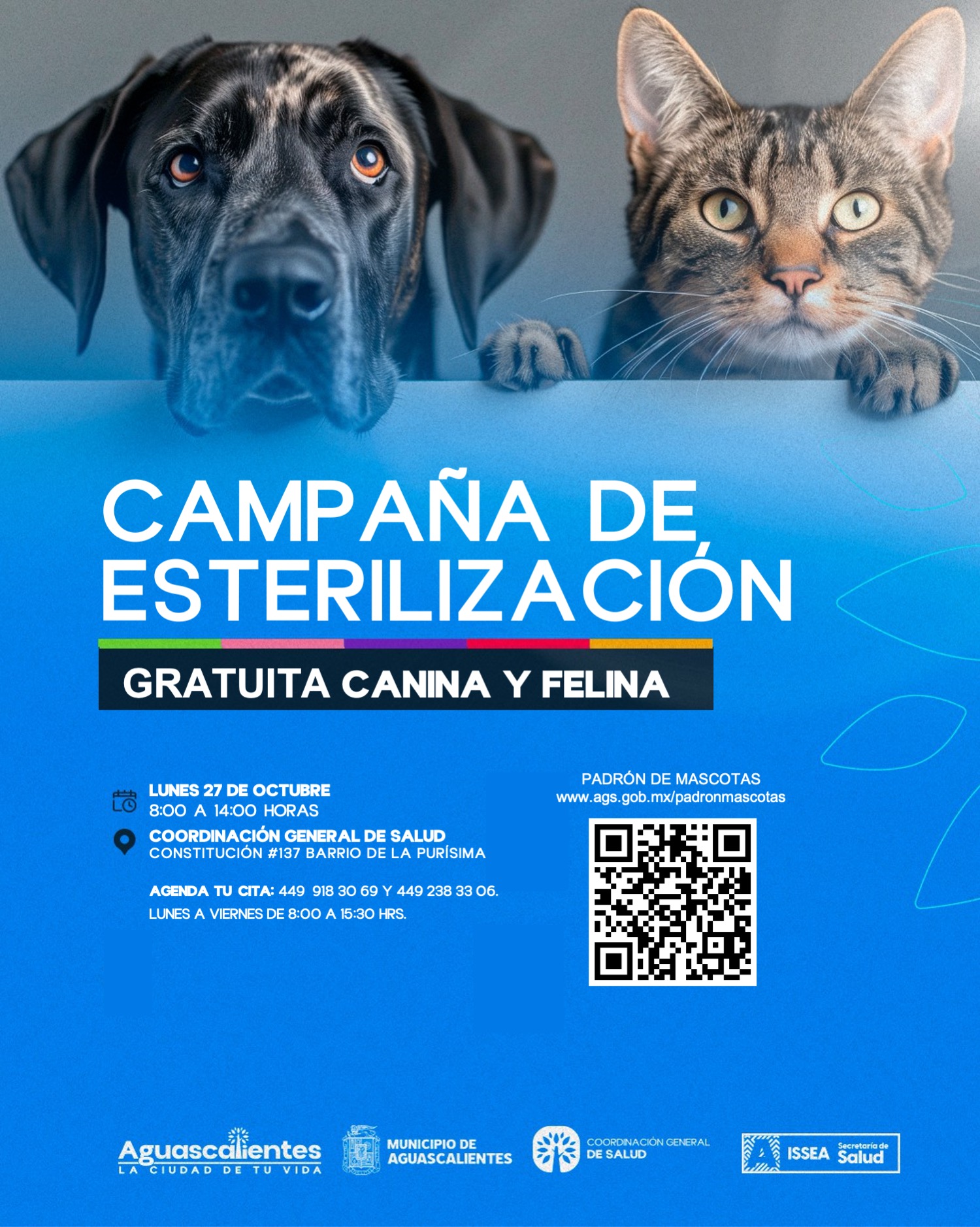 Gracias al trabajo coordinado entre la Coordinación General de Salud y la Secretaría de Salud del estado de Aguascalientes, este lunes 27 de octubre se realizará una jornada de esterilización para 60 mascotas, en la calle Constitución #137, en el Barrio de La Purísima, así lo dio a conocer María Teresa Rendón Esquivel, coordinadora general de Salud.