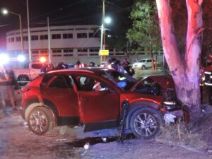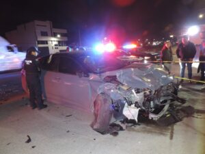 Un fuerte accidente se registró a las 11 de la noche de este domingo en la Avenida de los Maestros esquina con Avenida Providencia, en el fraccionamiento Rancho Santa Mónica, a un costado del Instituto Sanford, donde una mujer resultó prensada dentro de su vehículo tras un choque entre dos automóviles particulares.
