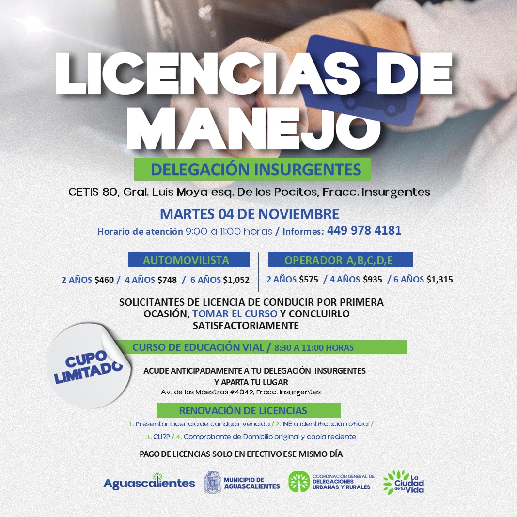 El Municipio de Aguascalientes informó que este próximo martes 4 de noviembre se realizará una jornada de renovación de licencias de manejo y se impartirá el curso de educación vial, como parte del trámite para expedir la licencia por primera vez.