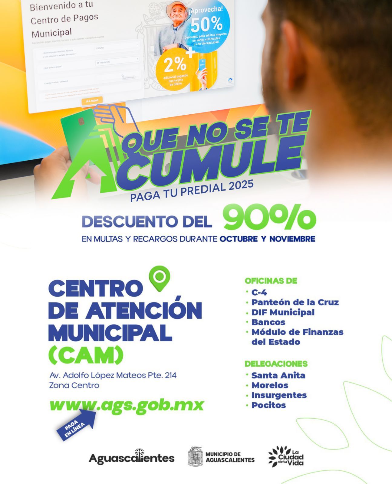 El Municipio de Aguascalientes, a través de la Secretaría de Finanzas, informa que durante todo el mes de noviembre continúa vigente el 90 por ciento de descuento en multas y recargos del impuesto predial, con el objetivo de que más contribuyentes aprovechen esta oportunidad para ponerse al corriente y regularizar su situación para el 2026.