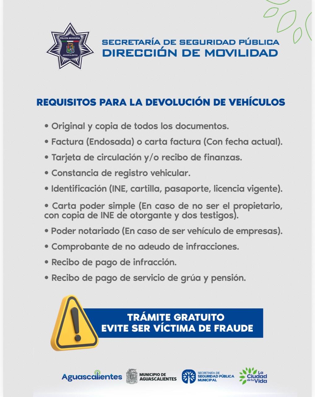La Secretaría de Seguridad Pública Municipal de Aguascalientes (SSPM) a través de la Dirección de Movilidad informa a la ciudadanía los requisitos y procedimientos para la devolución de vehículos que hayan sido asegurados y trasladados a la pensión municipal con el fin de facilitar y agilizar la atención a los propietarios.
