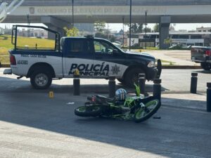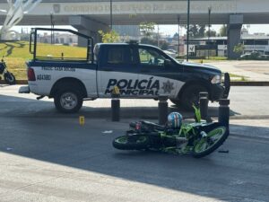 Un trágico accidente cobró la vida de un joven motociclista la mañana de este miércoles, luego de que fuera impactado por una patrulla de la Policía Municipal en la zona sur de la capital. El choque fue reportado alrededor de las 10:30 horas, en el cruce de Quinta Avenida y Avenida Aguascalientes, frente al fraccionamiento Villa Jardín.