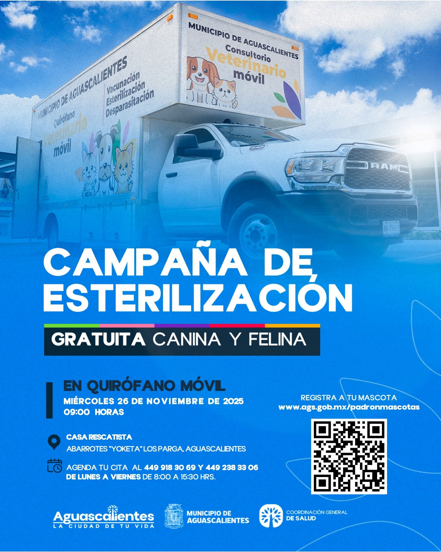 María Teresa Rendón Esquivel, coordinadora general de Salud del Municipio de Aguascalientes, anuncia que el Quirófano Veterinario Móvil se trasladará a Los Parga y a la Delegación Ojocaliente, para ofrecer los servicios de esterilización, vacunación antirrábica y desparasitación los días 26 y 27 de noviembre de 2025.