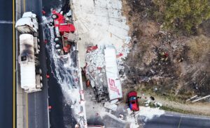 Tras el impacto, el tractocamión se volcó sobre su costado derecho y la caja con la carga se desprendió, cayendo junto con el vehículo Mazda. Varios costales de azúcar terminaron encima de la camioneta, aplastándola parcialmente.