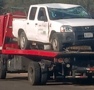 En el trayecto, sobre la carretera a Los Sabinos, la conductora perdió el control y la camioneta terminó volcada. Dos personas resultaron lesionadas y la unidad fue declarada pérdida total.