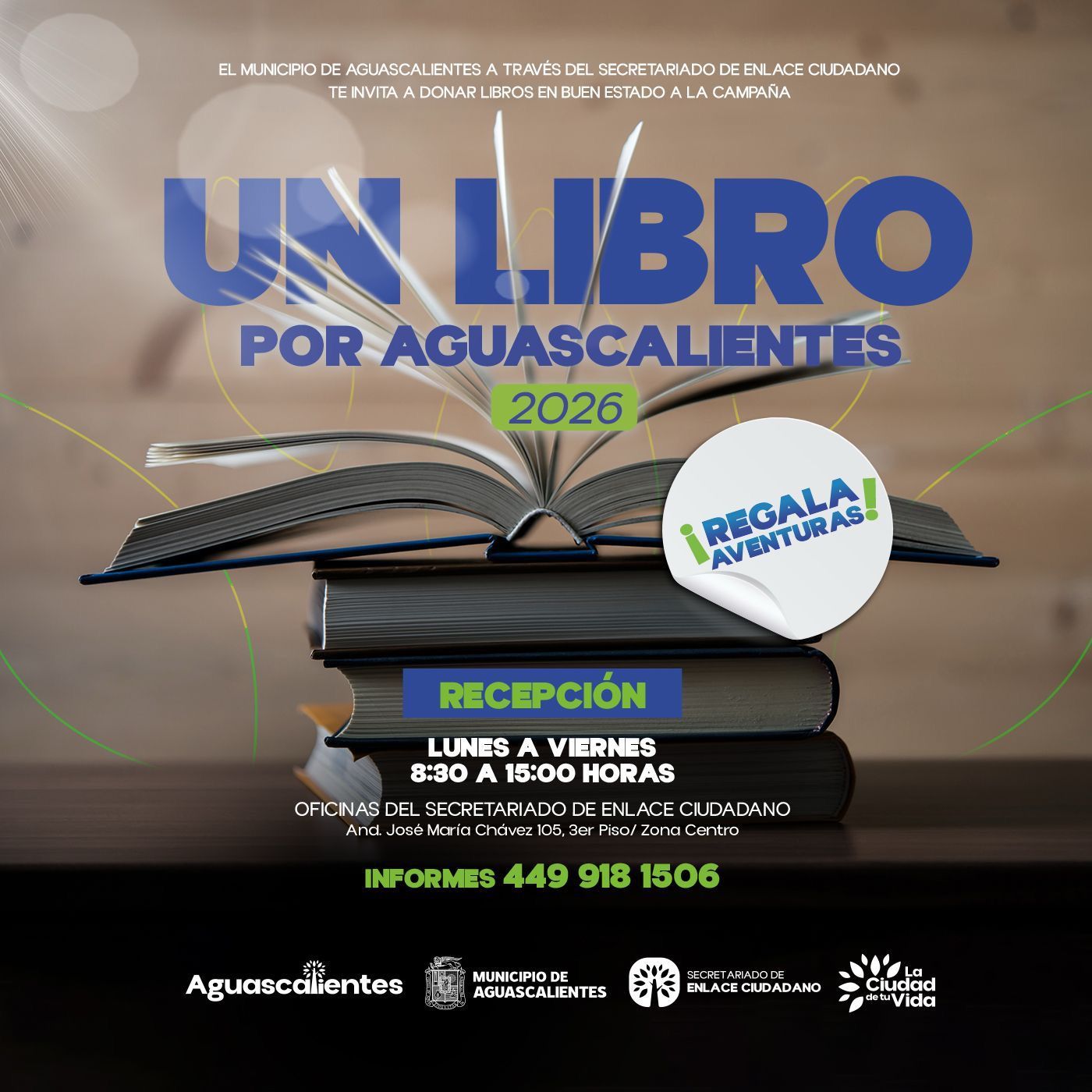 El Municipio de Aguascalientes a través del Secretariado de Enlace Ciudadano invita a la sociedad en general a sumarse al programa de donación «Un Libro por Aguascalientes» 2026, a través de la cual se busca fortalecer el acervo de las bibliotecas y el hábito de la lectura en todas las edades.