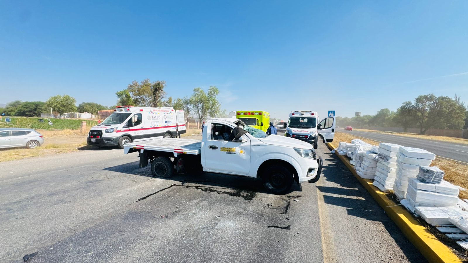 Al lugar acudieron paramédicos y elementos policiacos, quienes localizaron una camioneta Nissan NP300 en color blanco, propiedad de la empresa Sunshine, en la que viajaban tres trabajadores con destino al nuevo Agropecuario de Viñedos, donde transportaban bloques de papel.